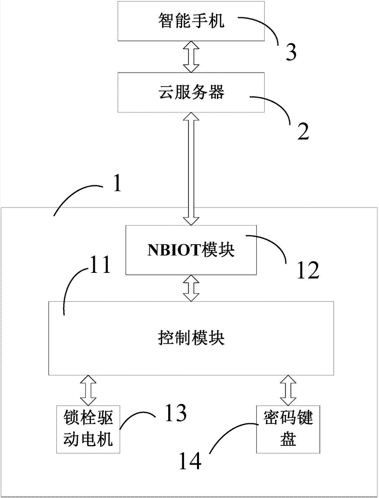 控制模塊11控制所述鎖體解鎖或鎖付,通信模塊12采用窄帶物聯(lián)網(wǎng)通信模塊(即NBIOT模塊),控制模塊11通過NBIOT模塊與一個云服務(wù)器2直接通信。因此,智能手機3就可以很快捷的通過云服務(wù)器2實現(xiàn)對互聯(lián)網(wǎng)智能門鎖1的運行與管理。